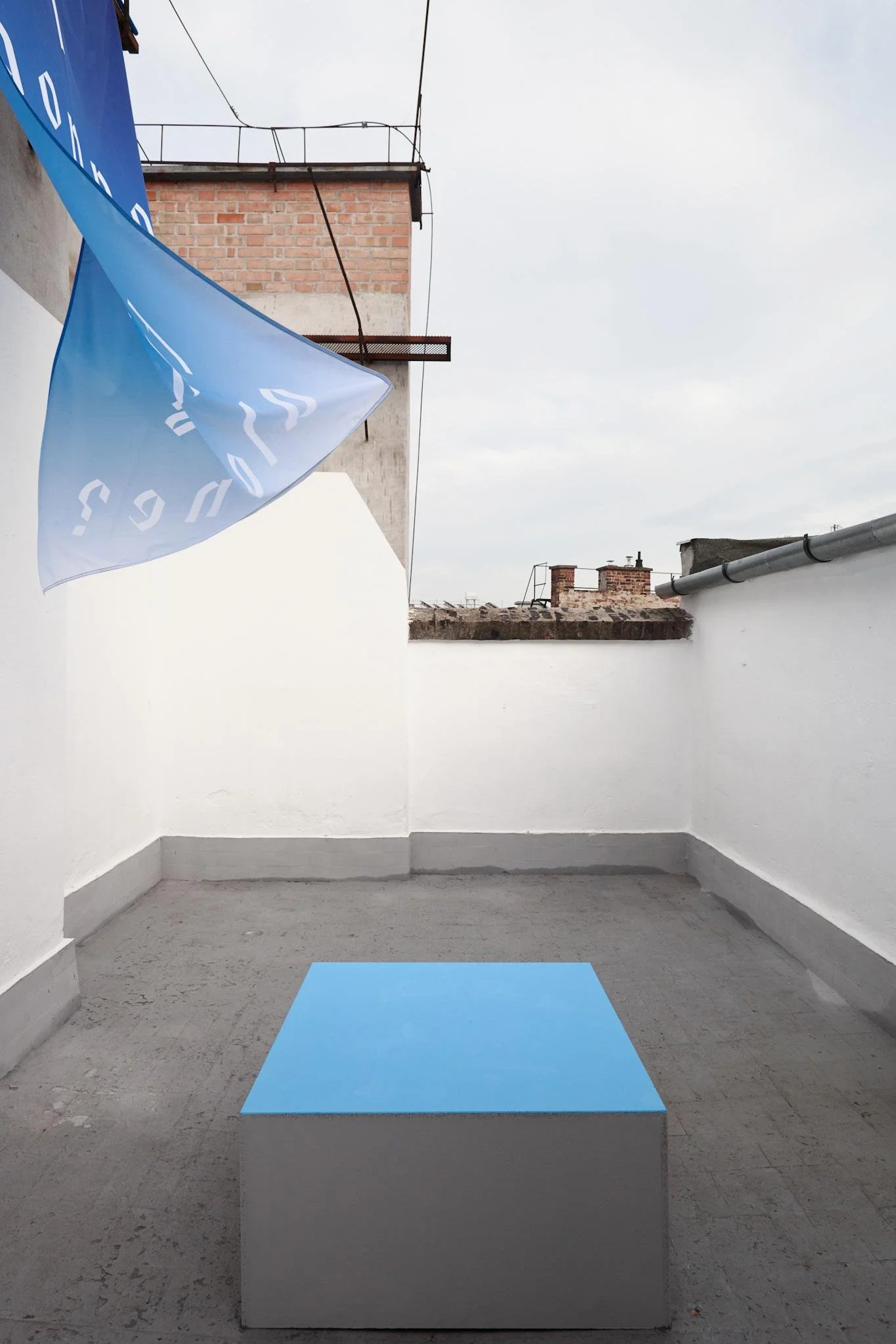 Print on fabric, 150 x 250 cm, wooden stage, 100 x 100 x 50 cm