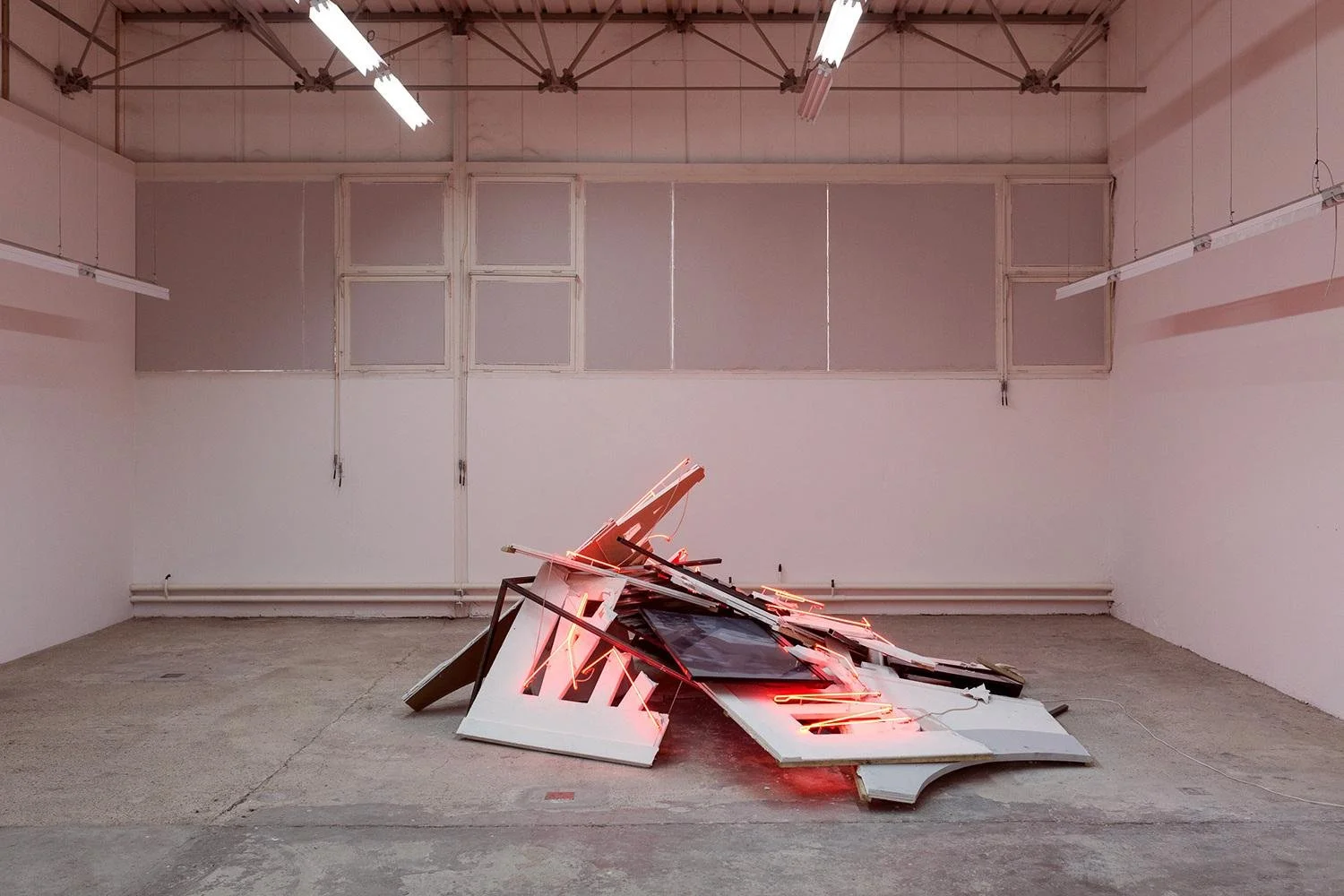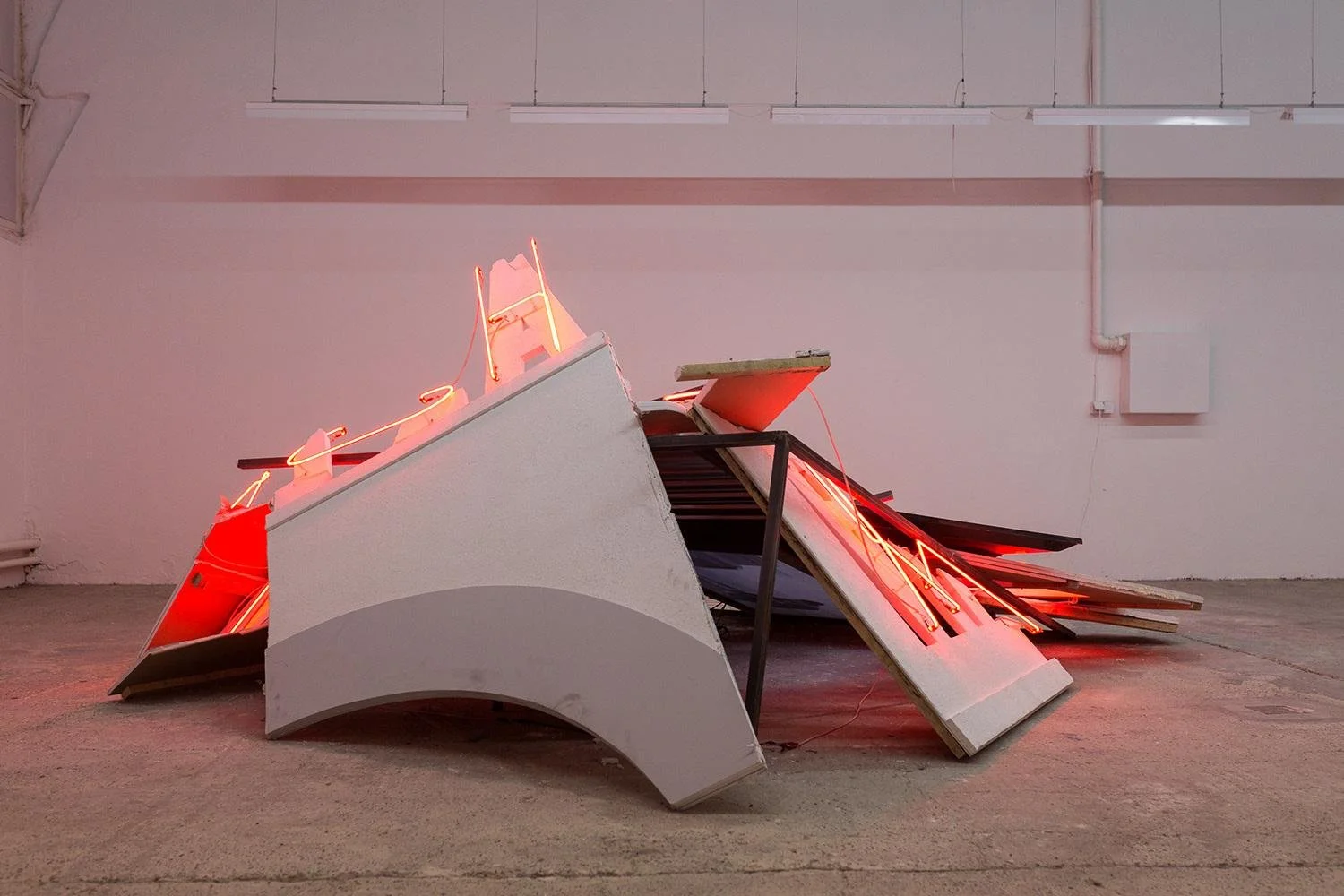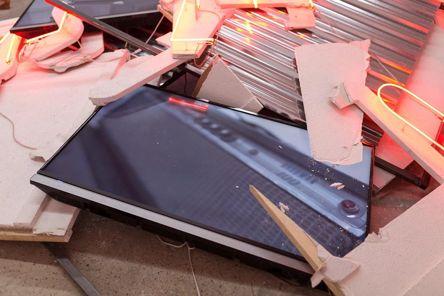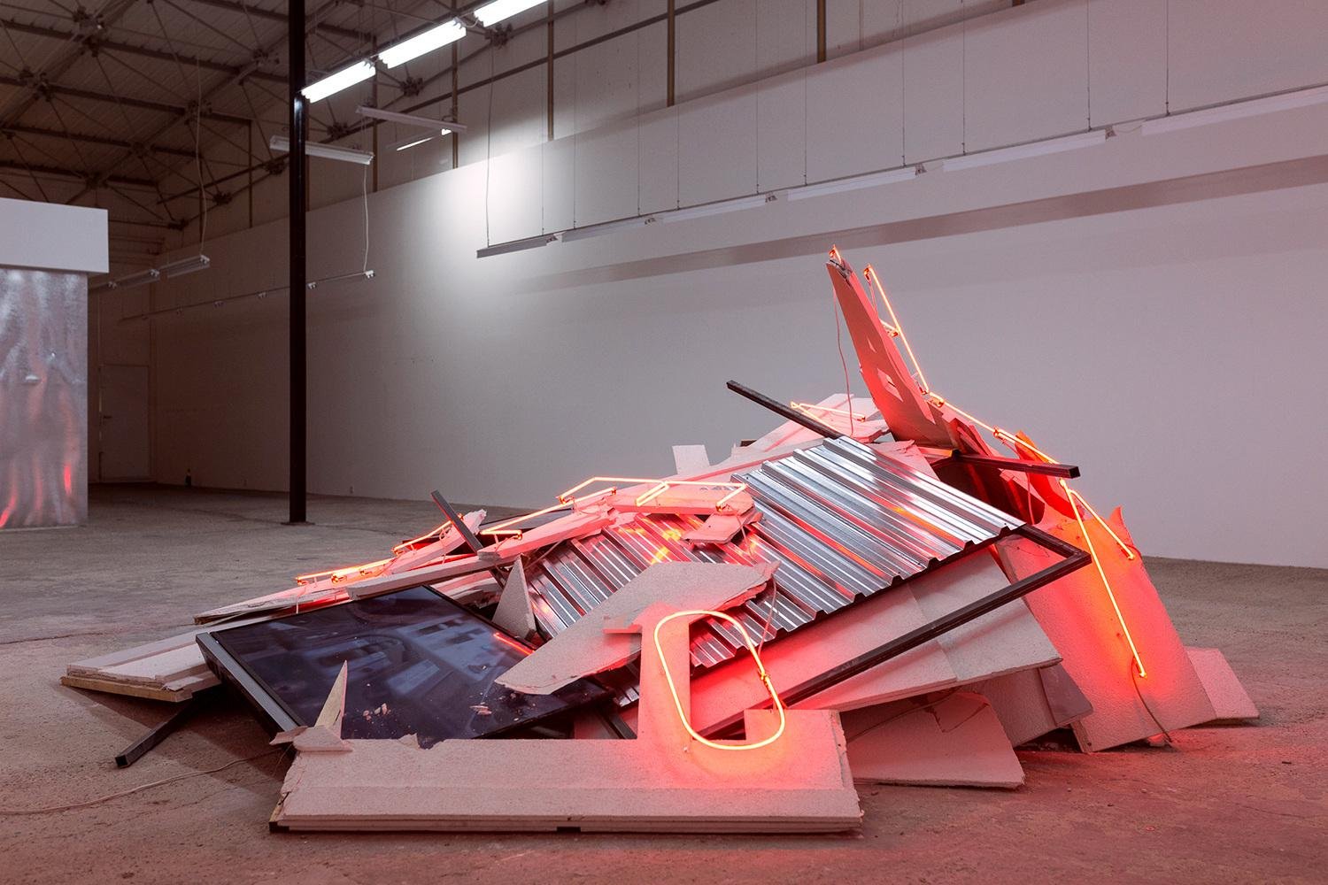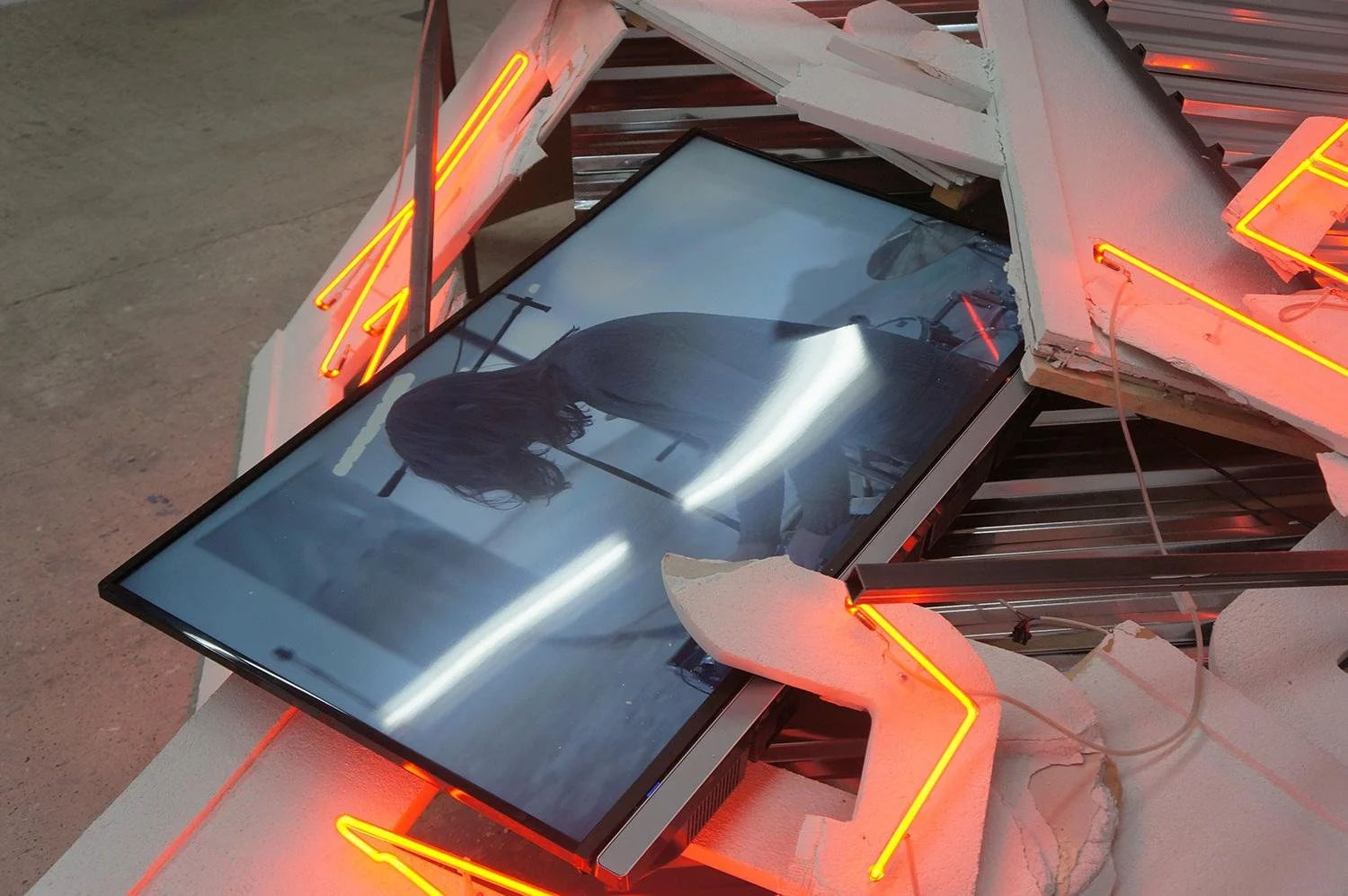 Plaster, neon, steel frame, metal, monitors, dimensions variable