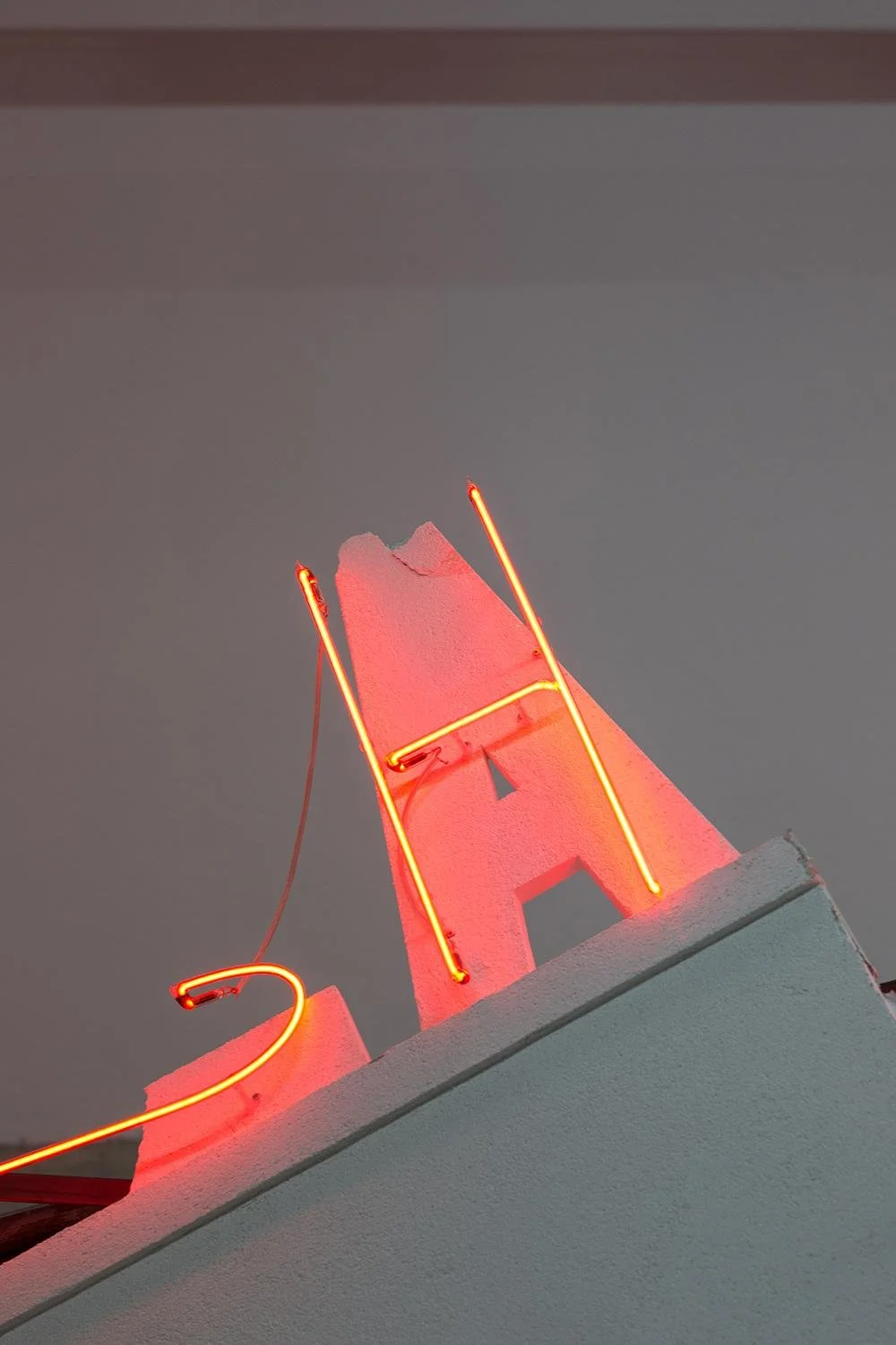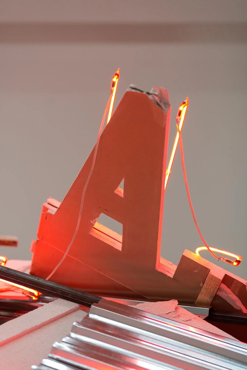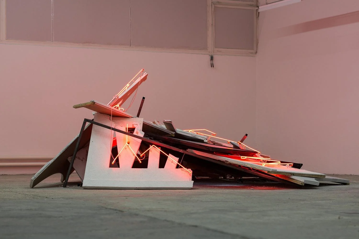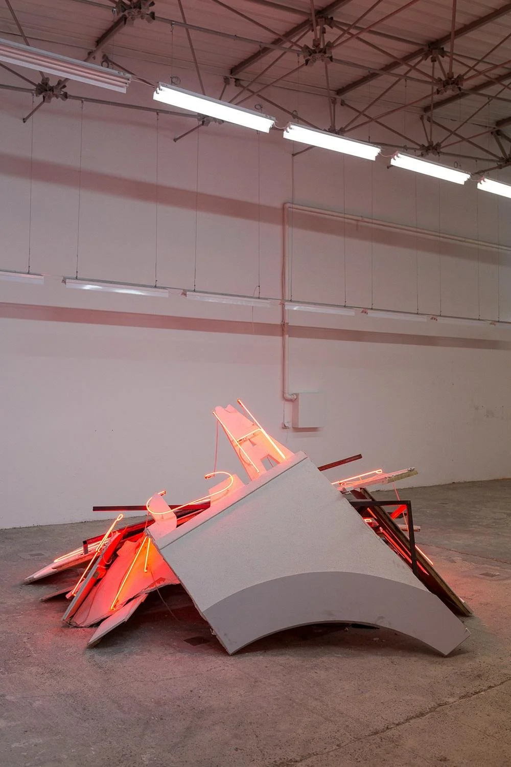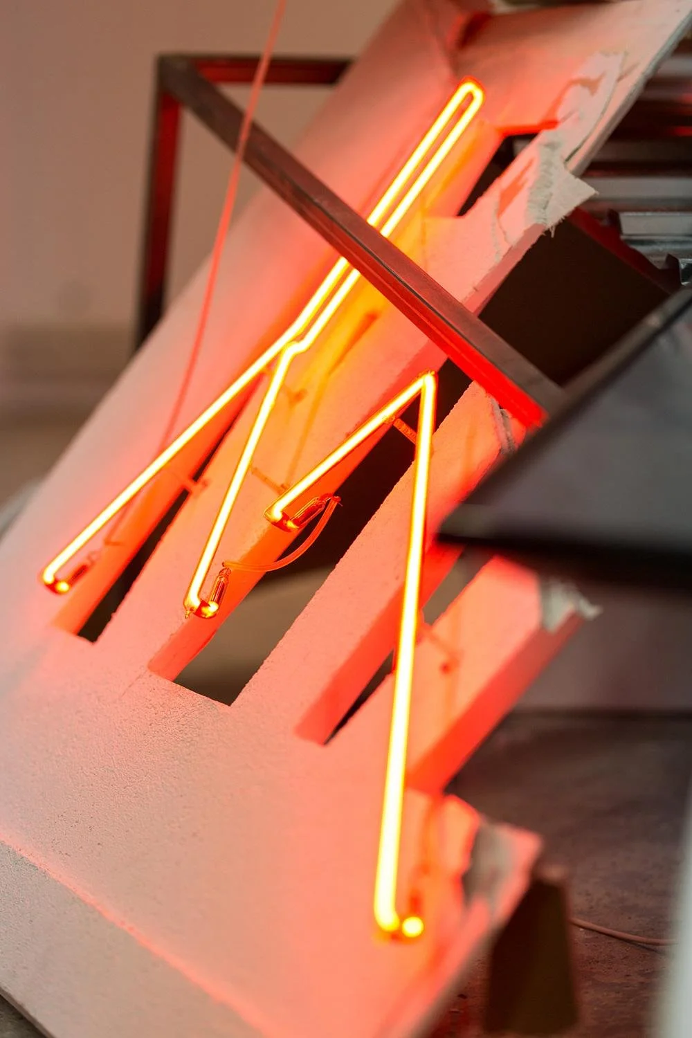 Plaster, neon, steel frame, metal, monitors, dimensions variable