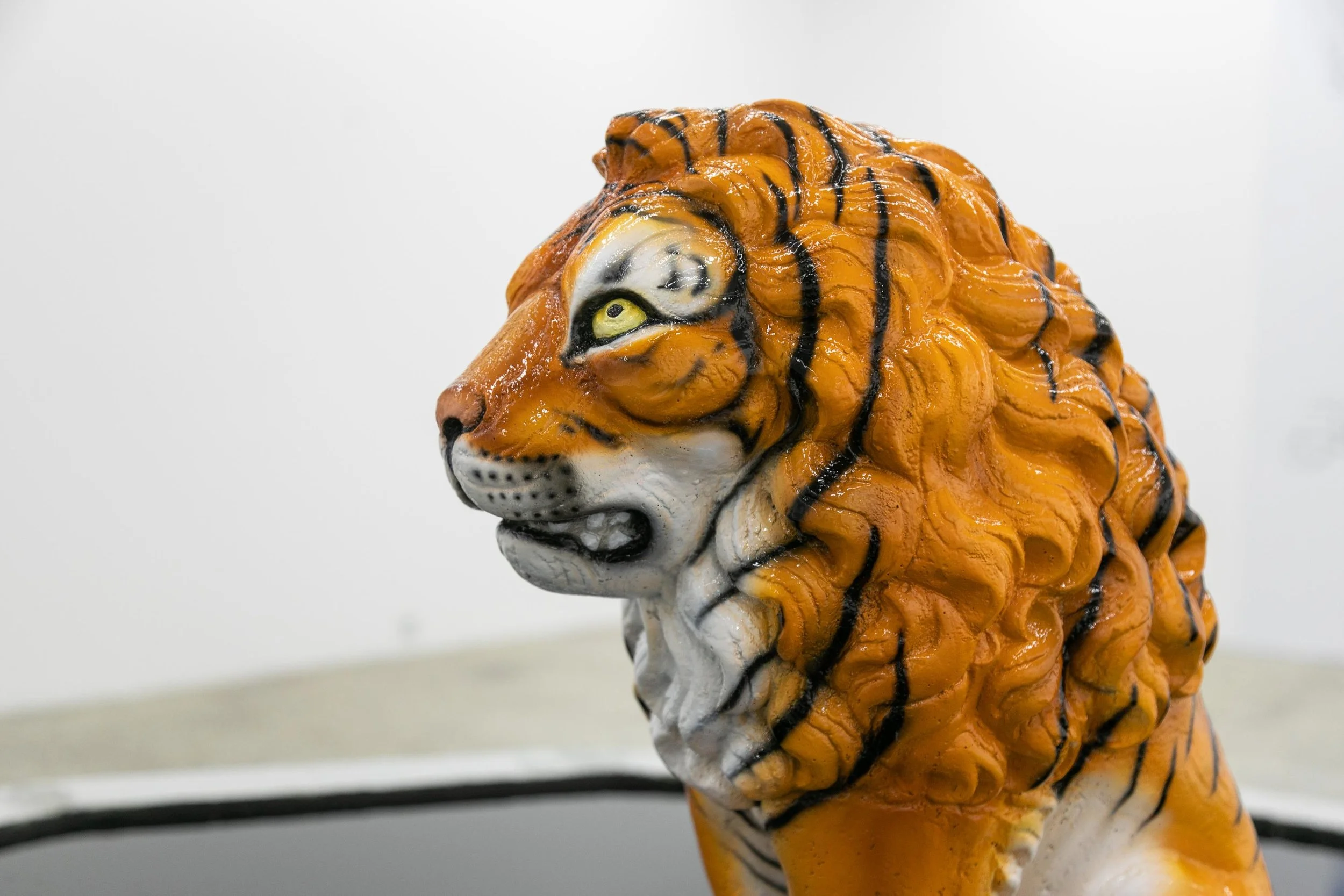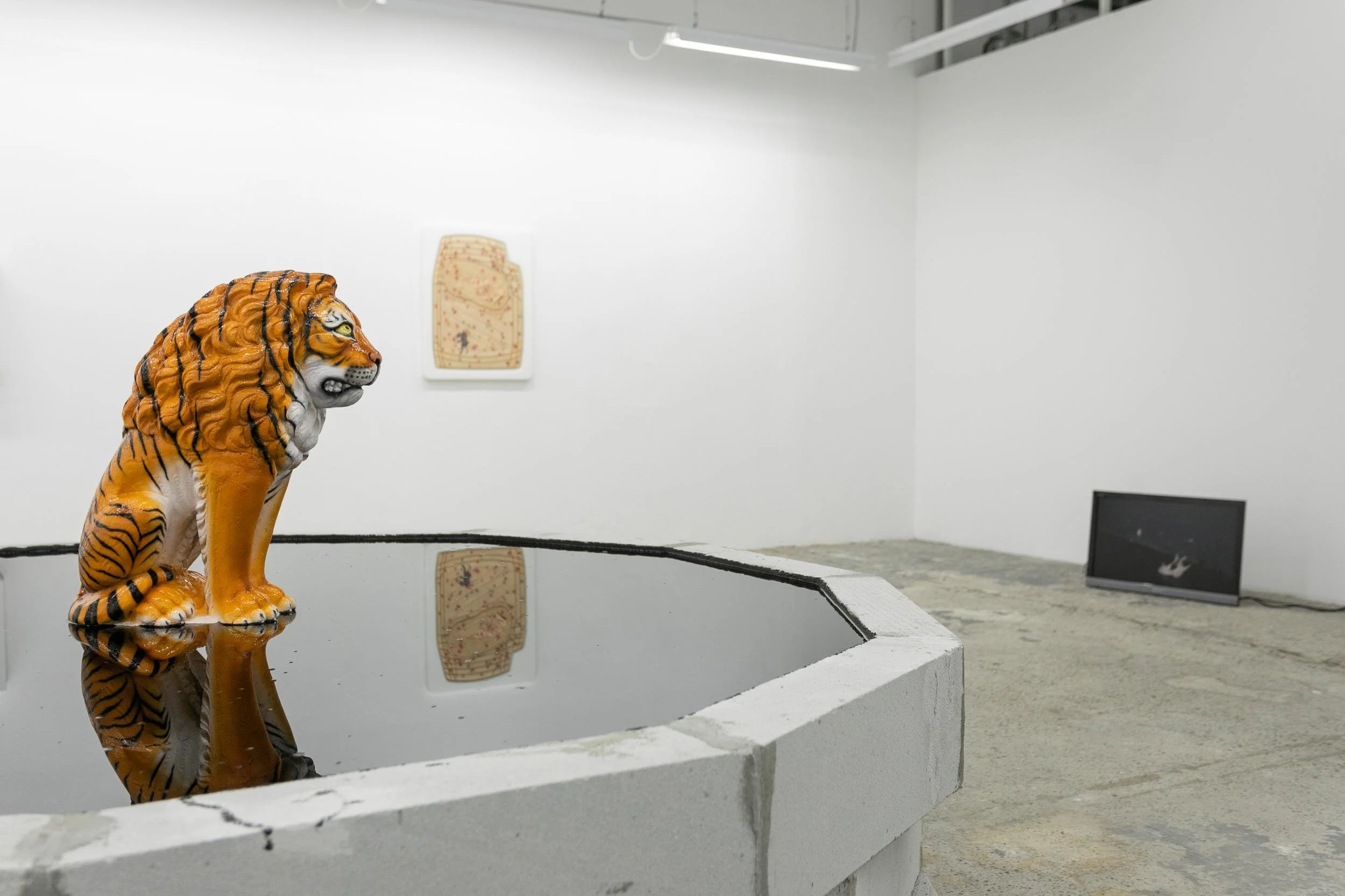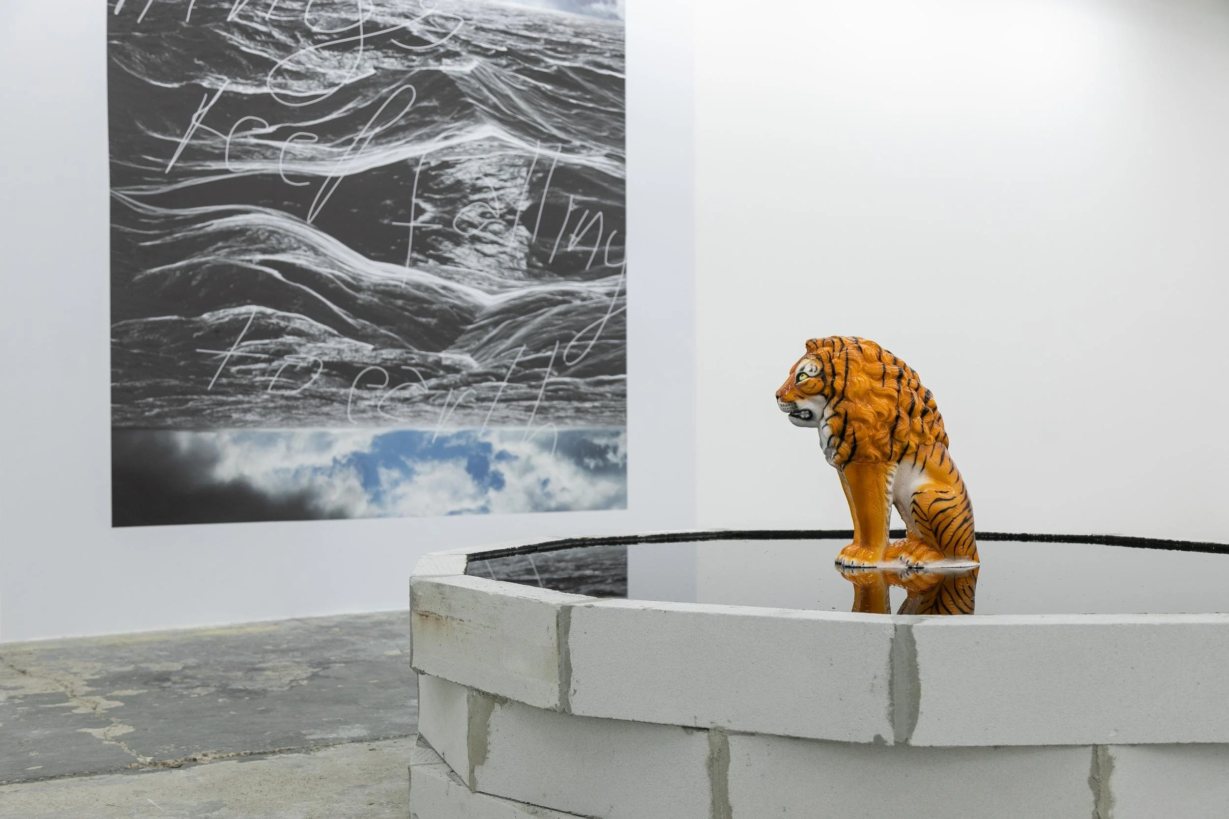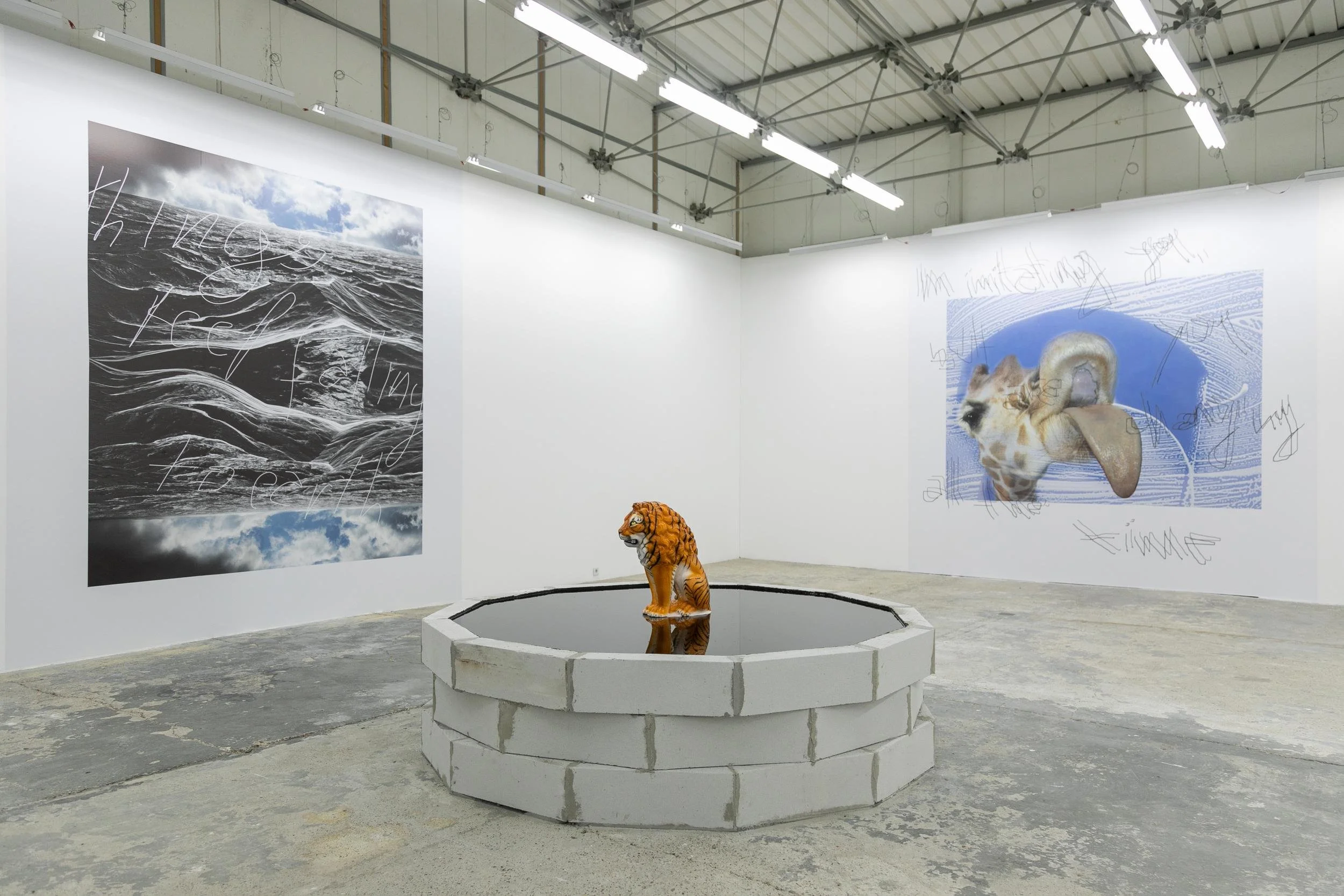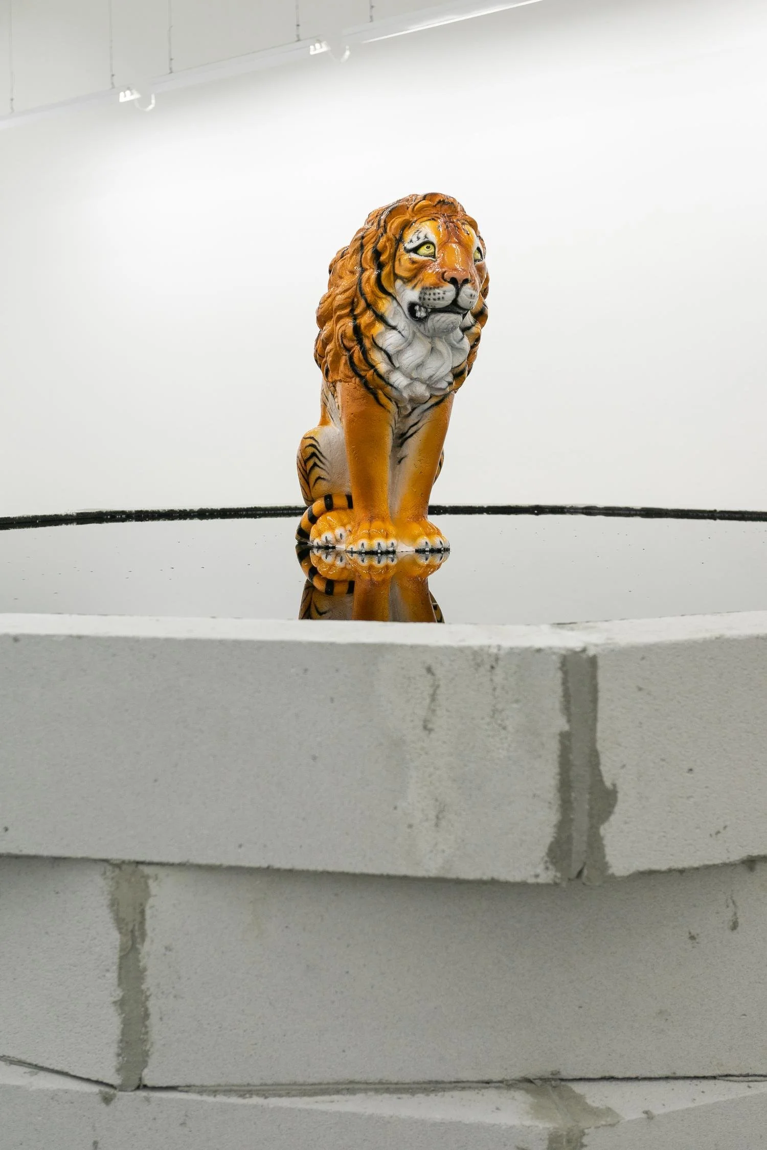Keeping up with the visual language he has developed through his work, strongly anchored in the aesthetics of contemporary digital culture, Sasha Tkachenko’s work was produced specifically for this exhibition. He places his predatory symbol, a hybrid of a lion and tiger, in a filthy liquid where its fiery nature is visibly extinguished. His expression delivers a punch – combining familiar association of the behavior of contemporary humans and the grimy and polluted discharge of consumer society, waste.