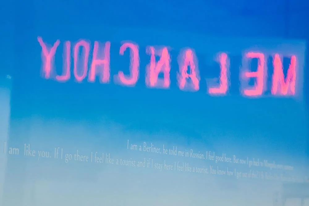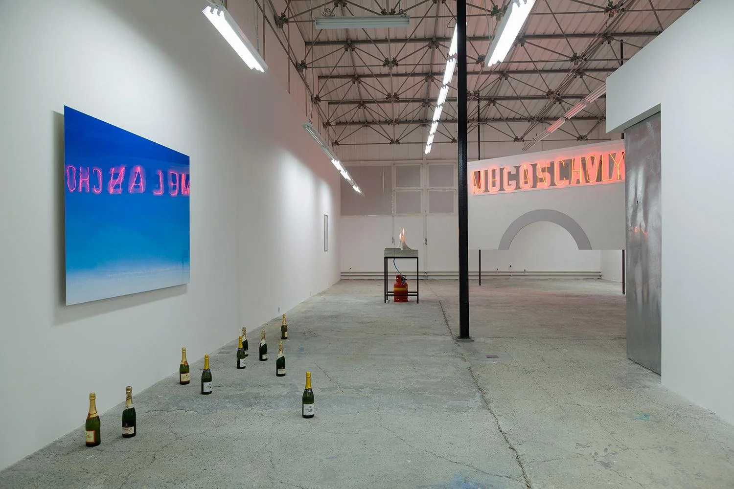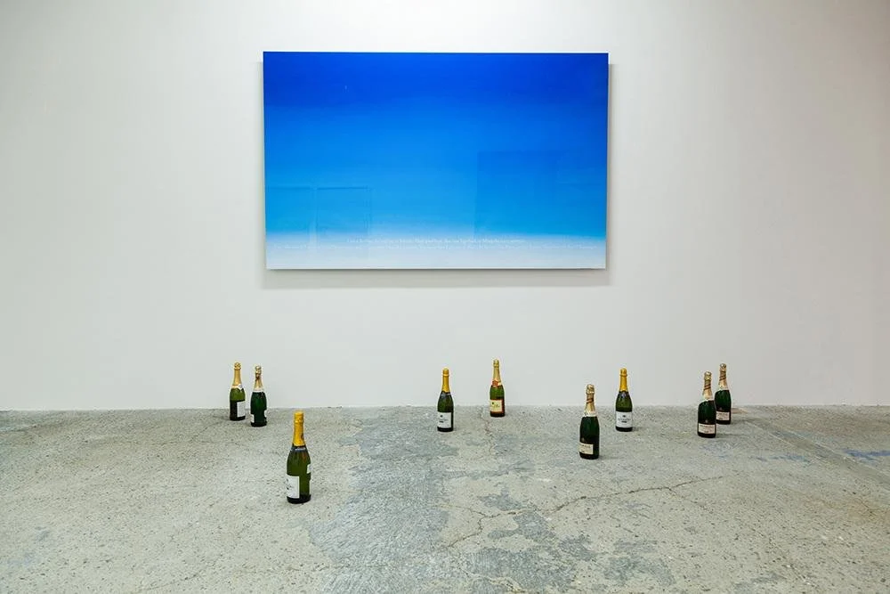 Both in the case of Sunset and I’m like you, landscape served as a basis around which the textual narrative was built. Both works come to life as an error by manual repetition and aim to increase the artificiality in creating an image out of a motive originating in nature.An aluminium panel treated with colours normally used on cars, polished to a high gloss, is transformed into a blue sky horizon. The horizon conceals a quotation from Future of Nostalgia (2005), a book by Svetlana Bojm. Champagne bottles placed on the floor of the gallery further emphasise the situation in which the problems of alienation in immigration are solved, if only for a moment.